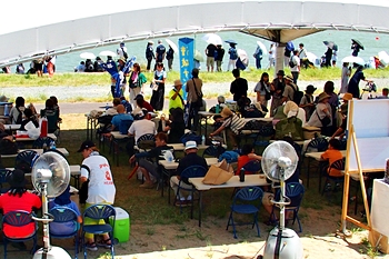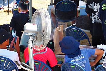 炎天下での観戦も仲々大変ですけど、福山市内を南北に流れます芦田川の土手には、この場所のみ1本の樹木が存在します。この樹木の下には、日陰を求めて数十名の観戦者の皆様が(^-^)