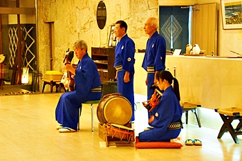 当館のロビーで、地元団体「立浪会」による佐渡おけさの披露会を開催しています。(4月〜11月、不定期開催)