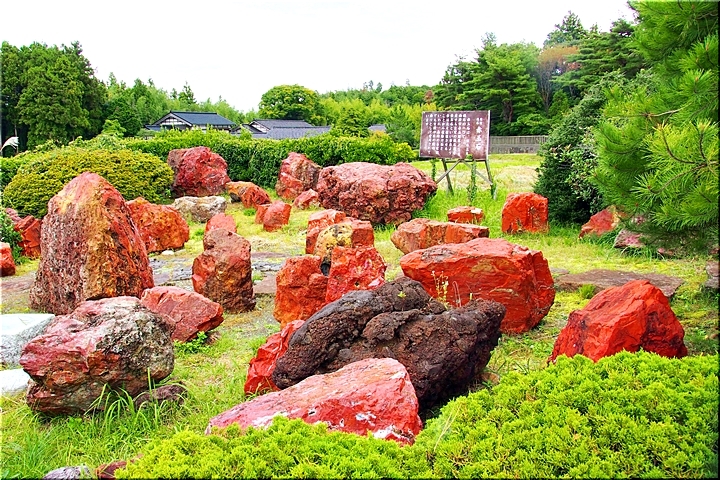真野観光センター≠ノは、後で立ち寄りますので、先に真野御陵≠ヨと向かいます。が、赤玉石が所狭しと並びました赤玉石庭園≠ノは、珍しさもありまして足が止まりましたネ(^-^)庭園には、こんな案内板が…