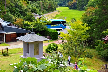 こんなモヤモヤ感に包まれていますと、バスは真野御陵(順徳上皇火葬塚)≠ヨと到着です。バスは、真野観光センター$^ん前の駐車場に。