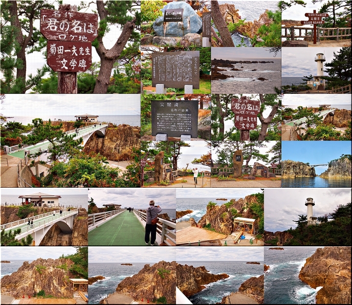 橋名は、遊仙橋(ゆうせんきょう)ですが、「まちこ橋」とも呼ばれ、松竹映画「君の名は」のロケで吊り橋のシーンが有名になりました。今は頑丈なコンクリート製の橋に架け替えられています。橋を渡った島を揚島(あげしま)といい「あげしま展望台」となっています。5月下旬から6月中旬頃には岩ユリやハマナスの花が岩場に咲きます。
