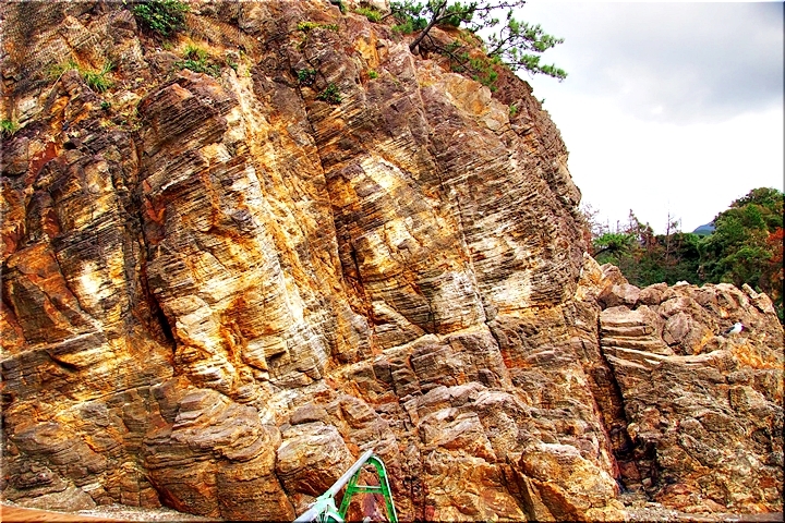>って剥がれやすい性質があります。尖閣湾の流紋岩はしま模様が縦方向に伸びているため、切り立