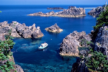 海中公園、そして日本の渚百選にも選定の佐渡を代表する景勝地、尖閣湾(せんかくわん)。海中透視船(グラスボート)が3月中旬頃〜11月下旬頃まで運航し、海上から尖閣湾の名付け親・脇水鉄五郎がフィヨルドに例えた断崖を見物することができます。運航母体は尖閣湾揚島遊園と同じなので、入園口で乗船の申し込みが可能。