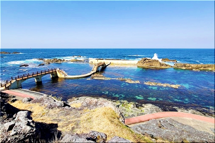 相川町市街地の北端、下相川の海岸にある岩礁。平坦な広い形状から千畳敷と呼ばれ、古くから名勝地として知られています。堤防に向かって海の上を橋がかかっており、迫りくる日本海の波や岩礁の様子を眺められます。波が穏やかな日には遊歩道を散策する人の姿も見られ、近隣の人々の憩いの場でもあります。