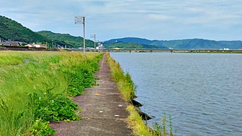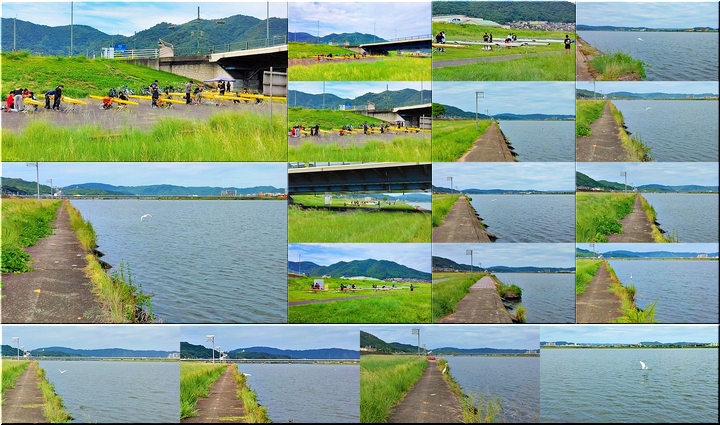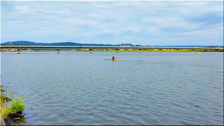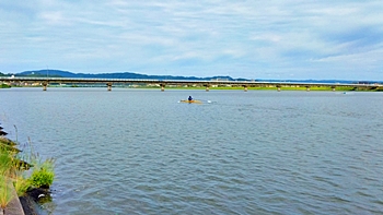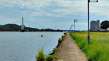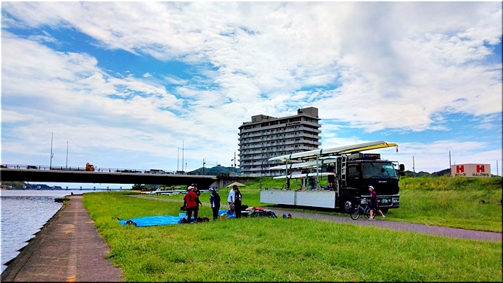 水呑大橋下で折り返しての帰路、川面で練習しておられます方に眼を向けながら芦田川大橋近くまで戻って来ますと、河川敷ではトラックに積まれたボートの荷卸し作業が始まろうとしておりました。