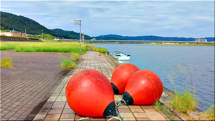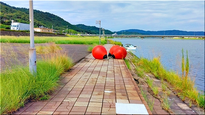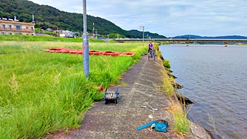 小水呑橋手前辺りの護岸には、赤いブイが3個置かれてありました。その少し先には、男性がお一人、ワイヤーロープを整理中。