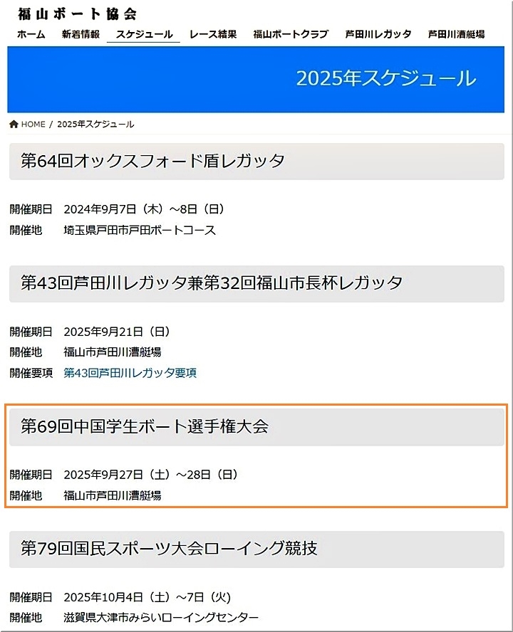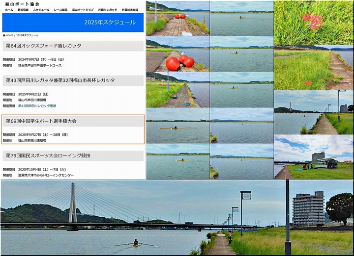 我が家に帰りましてから、WEB上で福山ボート協会≠フホームページを確認してみましたら、ふ〜ん、「第69回中国学生ボート選手権大会」の開催でありました。