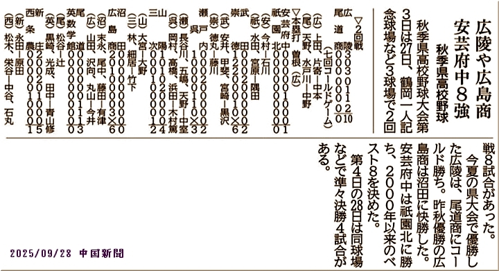 広陵・安芸府中・崇徳・呉・山陽・広島商・尾道・新庄の8校が準々決勝に進出です。備後勢と言うか福山勢は、昨日、英数学館が敗退で全滅ですねぇ〜残念。英数学館に期待していたのですけど…