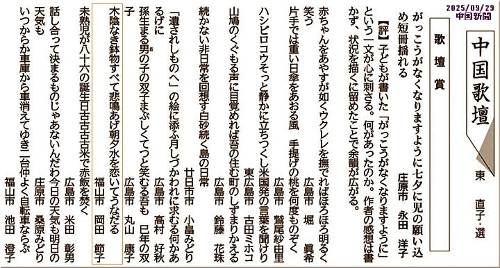 本日の中国新聞朝刊紙上に、また、従姉の投稿作品が…