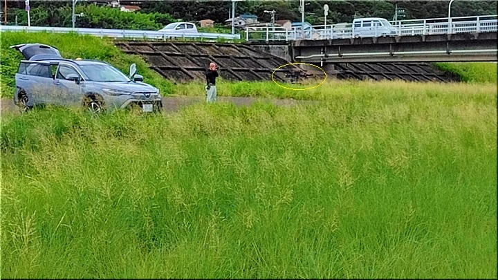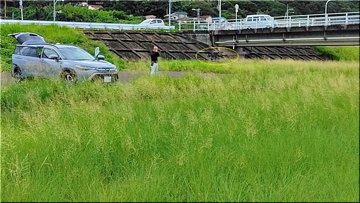 ひょっとしたら、その辺りの土手下(河川敷でない側)で、工事か調査でもしておられるのかも…で、今からドローンで現場撮影を行われますのかも…