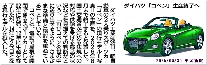 ところで、本日の朝刊紙上にダイハツ「コペン」生産終了へ≠フ記事掲載が。