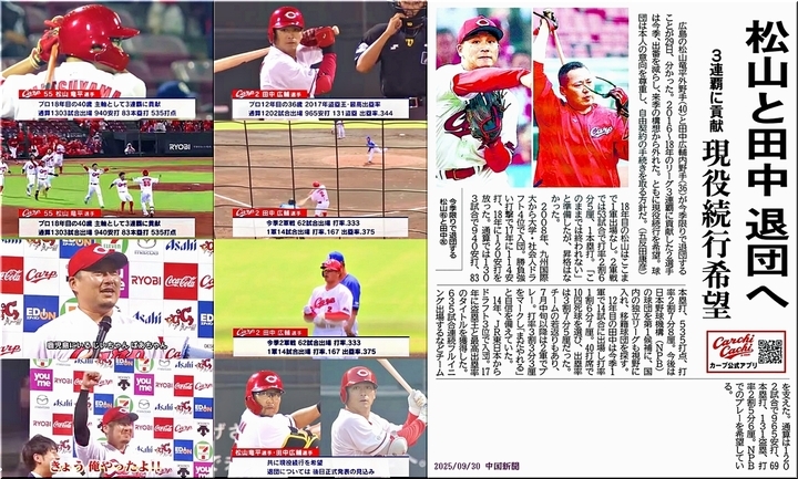 本日の朝刊紙上で知りましたけど、松山竜平・田中広輔両選手の同時退団とは…寂しいですネ…