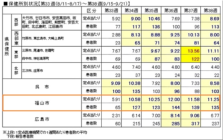 ここ最近の、福山市、広島県のコロナ感染状況を確認してみますと、福山市保健所管内とか東部保健所管内では感染者も多い様子。そぅ言えば、水呑小学校ではコロナ感染で学級閉鎖もありましたとか…