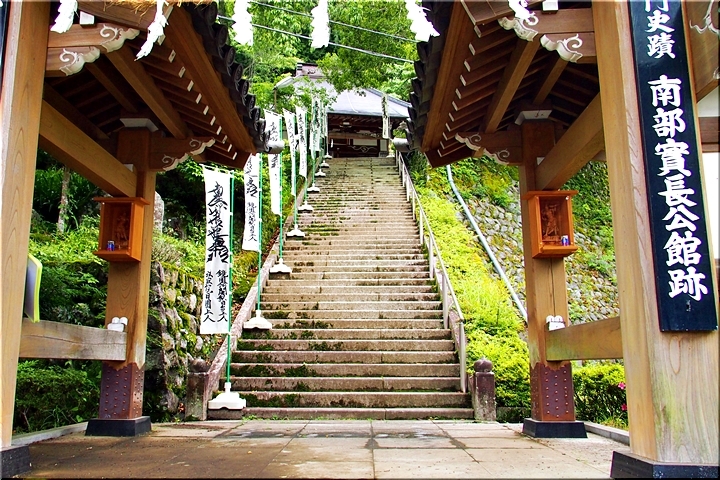 一言:南部氏館跡は身延山久遠寺の南の台地上にあったとされ、現在は鏡円坊となっている。鏡円坊は実長の次男がそれまでの館から寺に改めたとされる。