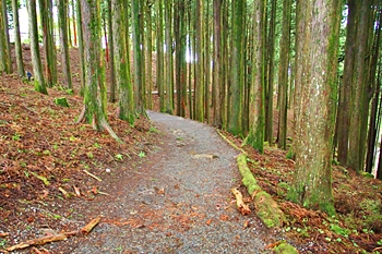神通坊≠ヘ、この登山道案内図が設置してあります場所で、ひのや旅館≠フスグ近く。裏参道は、距離的には表参道より長いのでしょうけど、下りですから、まぁイィかと(^-^)