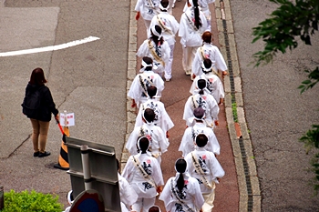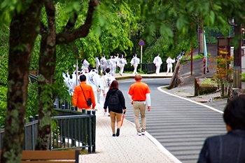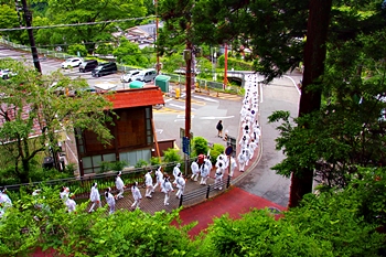 久遠寺駅に下りて来ますと、白い行衣を身に付けた結構な人数の団体さんが、三門方向に下山しておられます。この方達の後方をGONsan達も三門へと向かいます。