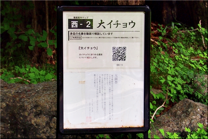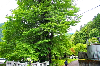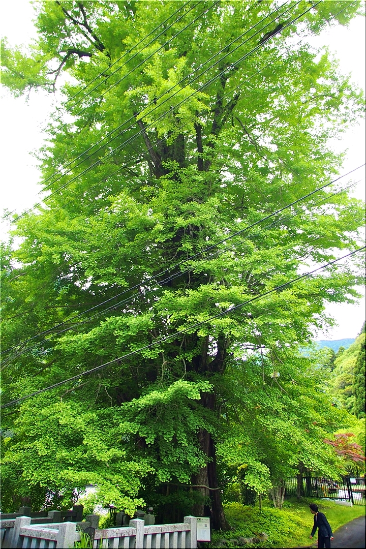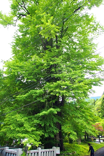 久遠寺三門を通り過ぎて、ロープウェイ乗り場に向かう道の途中、左手に立つイチョウ。現環境省データベースでは、本行坊のイチョウとされている。