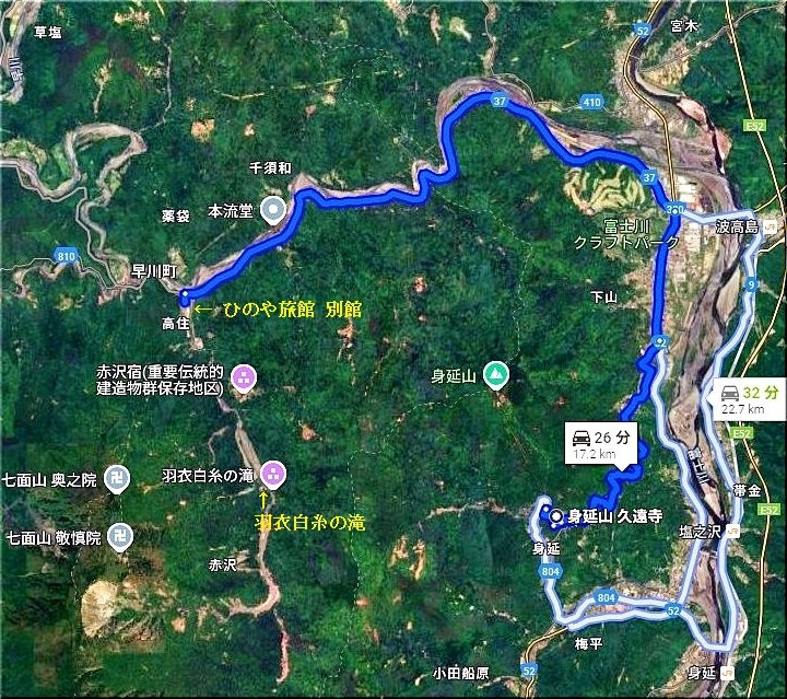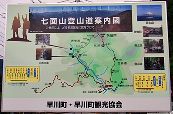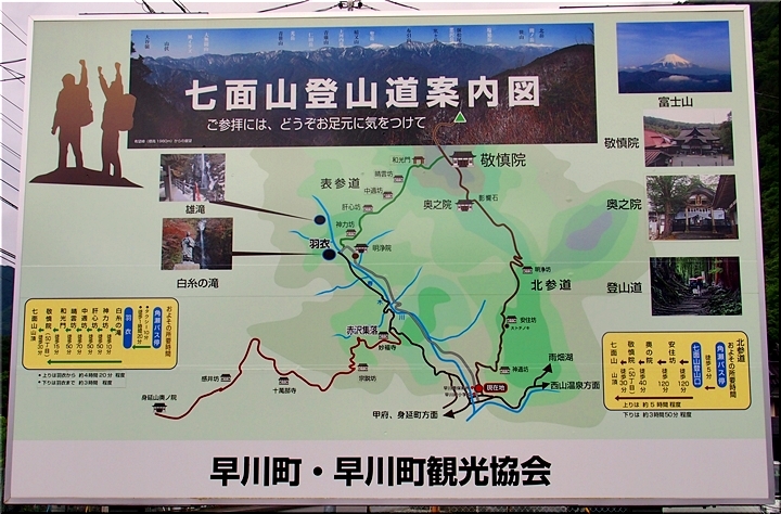 ナビに任せて向かって行きますと、15分程度でひのや旅館°゚くに到着です。旅館近くに設置されました「七面山登山道案内図」に眼が止まり、暫し拝見です。