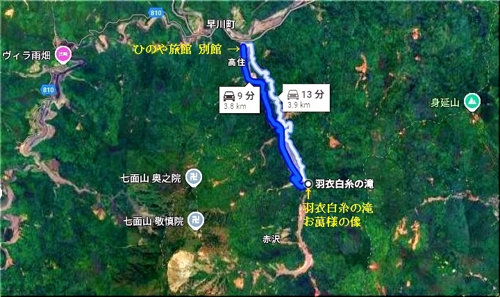 ところで、今からどぅしたものか…と、暫しの思案はありましたけど、ひのや旅館≠ヨのチェックインは17:00までならイィだろう…と、このままひのや旅館¢Oを素通りし「羽衣白糸の滝・お萬様の像」を拝観します事に。