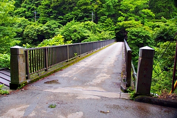 七面山の表参道入口(羽衣はごろも登り口)から後ろを振り返ると羽衣橋の向こうに滝が見えます。この「白糸の滝」のたもとには「お萬の方」像があります。