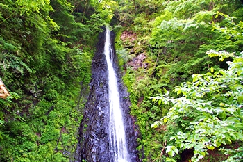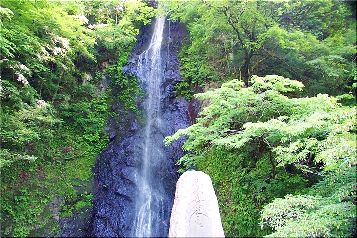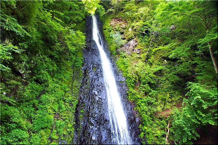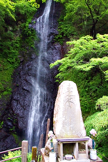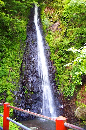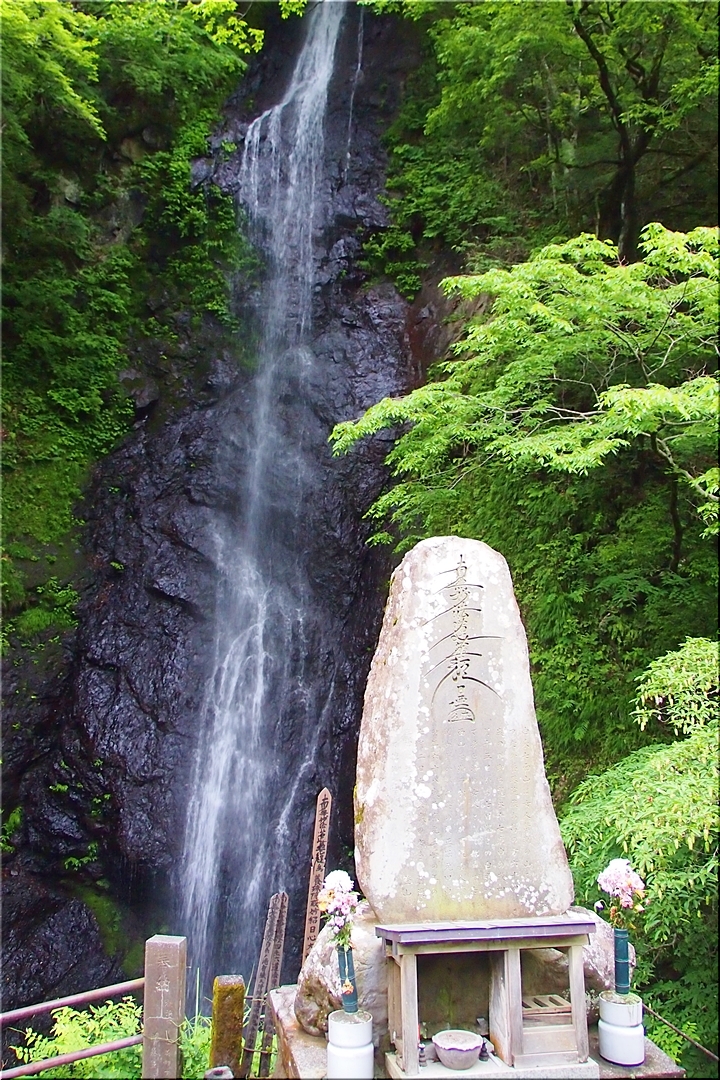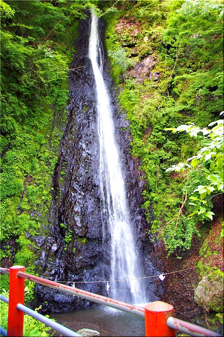 羽衣白糸の滝は、黒い岩肌に水がぶつかり白い筋になって流れ落ち、文字通り白糸のような美しさがあります。滝見の観光地ではなく、信仰の滝と言えます。