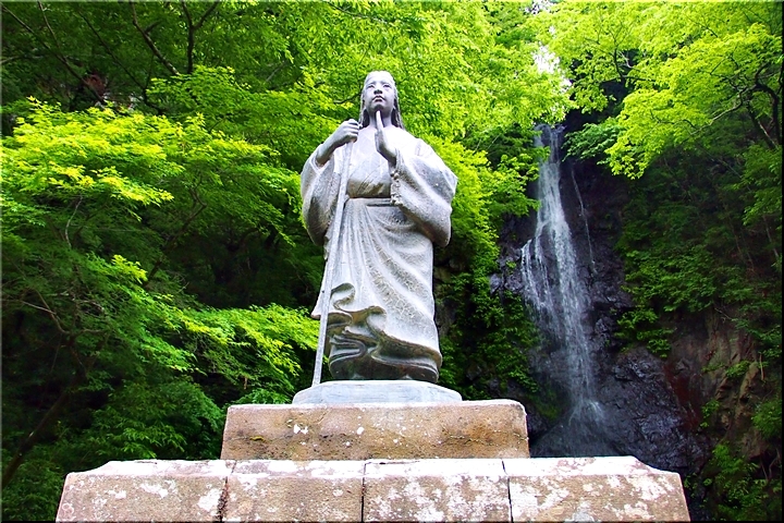 とにかく、予約通りタクシー来訪で、まずは、羽衣白糸の滝・お萬様の像≠ヨと運んで貰います事に。