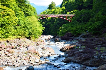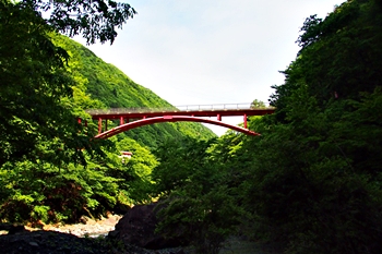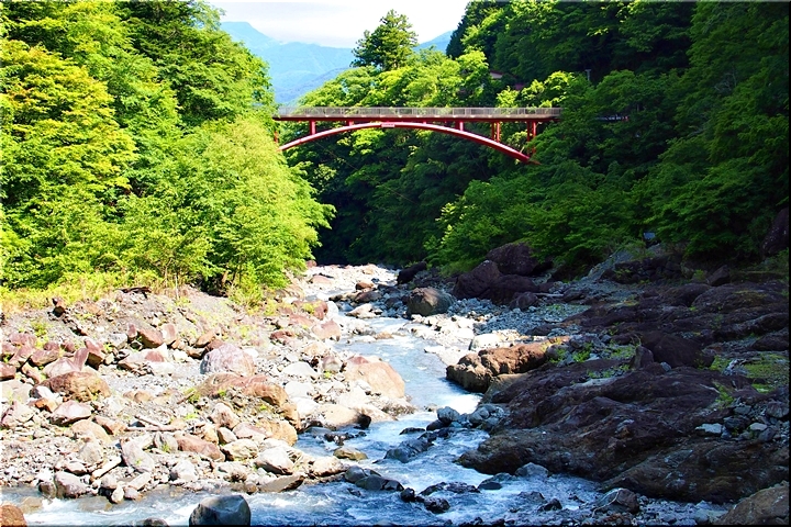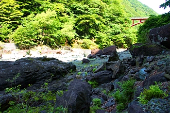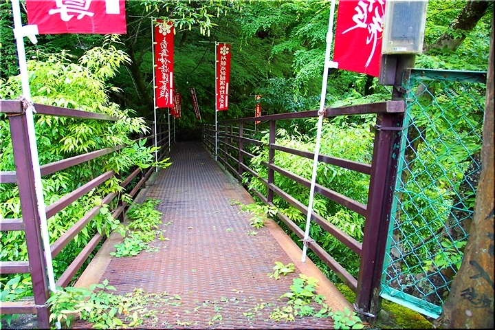 後方を振り返りますと、お萬様の像=`七面山山門≠結びます赤い「羽衣橋」…仲々キレイでしたネ(^_^)v