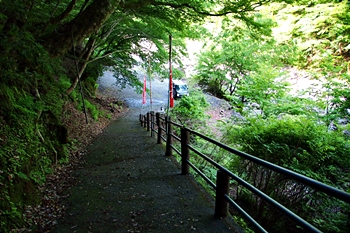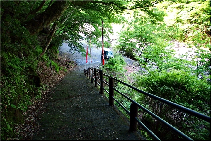 お萬様の像≠ノ到着しますと、早速、弁天堂・勇姿の滝「雄滝」≠ヨと向かいます。参道を下って行きますと脇に車が一台。んっ!?…この車、どんな方法でここまで来ましたのでしょう?…春木川沿いの参道は弁天堂・勇姿の滝≠謔闖纓ャには進めなかったような…