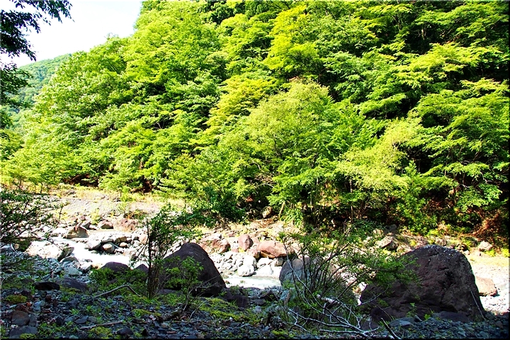 勇姿の滝は、羽衣白糸の滝から河原をさらに遡るとあります。勇姿の滝も黒い岩肌に水がぶつかりながら白くはじけながら流れ落ち、迫力のある美しい滝です。