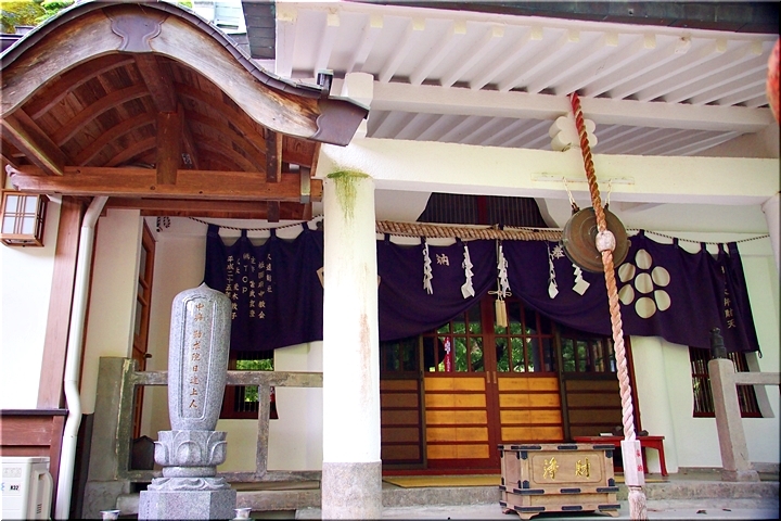石段を上がりますと弁天堂≠ノ到着です。建物の入口には「日蓮宗 日朗雄滝 日教協会」と記載の看板が…