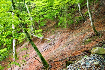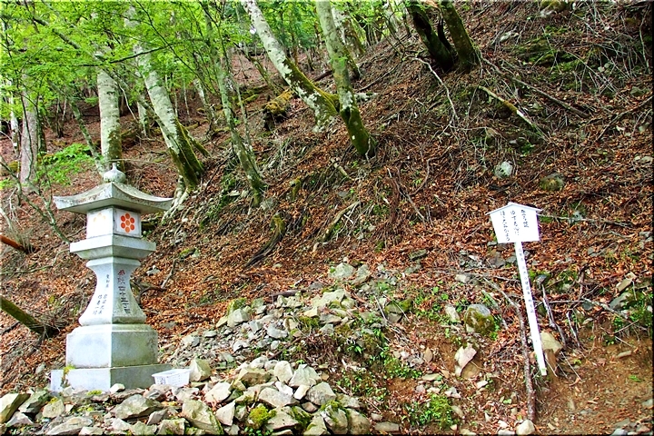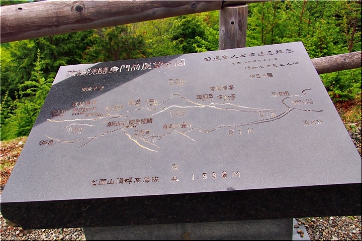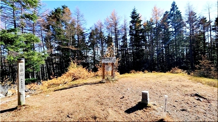 せっかく訪れましたのですから、御来光遥拝所≠ゥら七面山山頂≠目指しますと、スグに世界平和誓塔≠ェ存在し、先に進み勾配がなだらかな雰囲気の良い林の中を歩きますと、大崩落のナナイタガレ≠フ縁を沿うように登った先に七面山山頂≠ェ存在しますようであります。