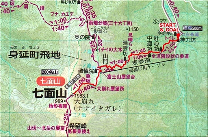 JR身延線身延駅からバスで早川町角瀬の七面山登山口下車。タクシーで表参道の始まる羽衣まで入る。敬愼院まで五十丁標高差1,200メートルは相当なものだが、さすがに歩きやすく道は整備されている。信者の道のりは敬愼院までだが、登山としての七面山頂上は、ナナイタガレの淵を通ってさらに三百メートル近く登らねばならない。健脚なら日帰りも可能だが、敬愼院に一泊させてもらうのが順当だろう。山全体が宗教上の聖地なので、登山者といえども配慮は必要である。全行程9時間。