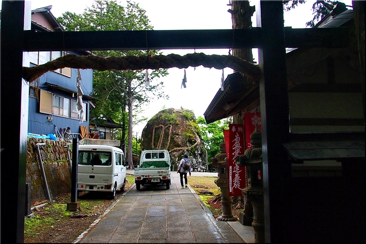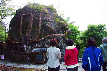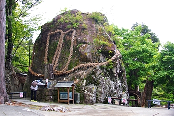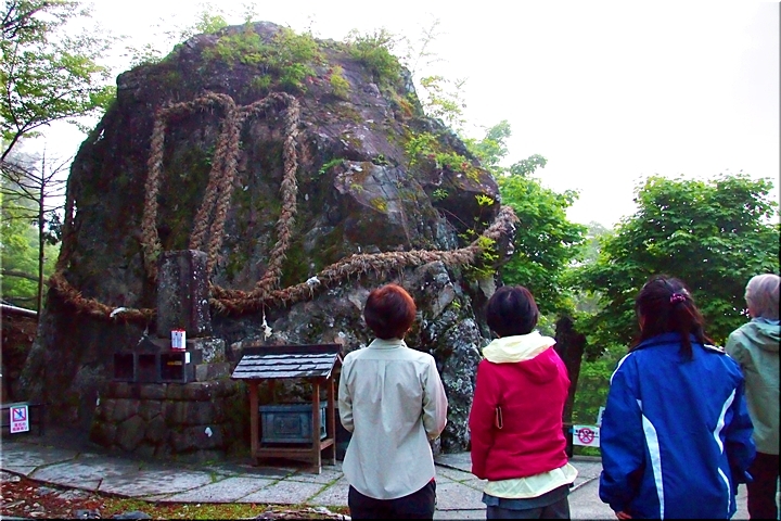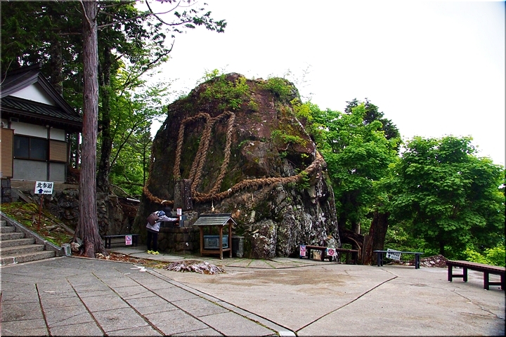 二ノ池≠横目にノンビリとした歩行でしたけど、敬慎院境内から20分足らずで奥の院≠ノと到着です。正面に見えますのが影嚮石(ようごうせき)≠ナすネ。その手前にはナンバープレートのありません計四車が二台駐車です。