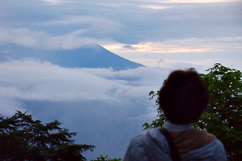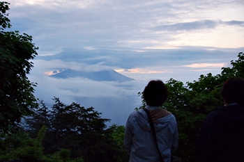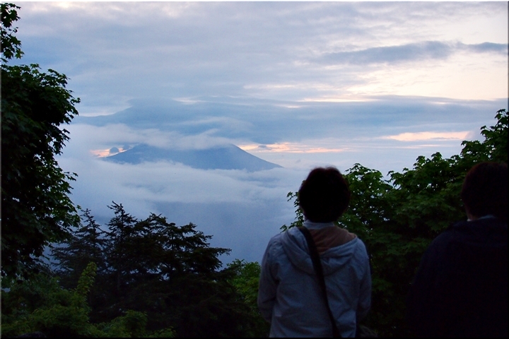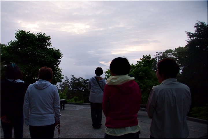 翌朝ご来光参拝≠ナ外に出ますと富士山頂きは見えていましたけど、次第に雲に覆われご来光参拝≠ヘ叶いませんでしたネ。皆さんがお集まりの頃には、富士山も雲に覆われてしまいましたねぇ〜