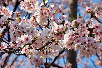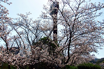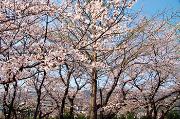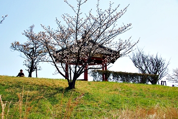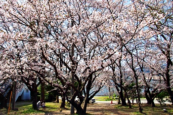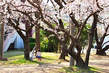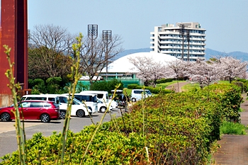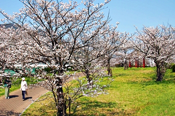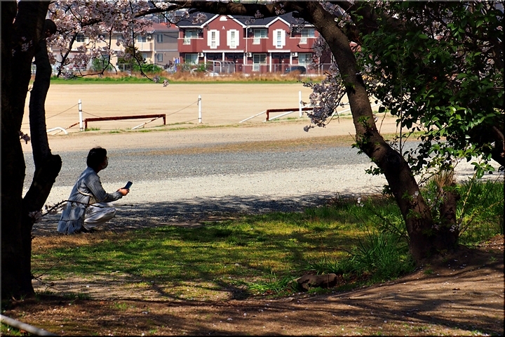 福山市民球場一塁側から多目的広場方向に向かいますと、母と娘さんの親子連れ、そして、初老の女性がスマホ片手に…皆さん思い思いにサクラを楽しんでおられます。