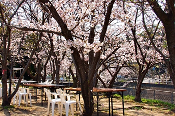 この方達を横目に、ライト側外野席西側の水呑川沿いにヤッて来ますと、桜の木の下にいくつかのテーブルとイスが…