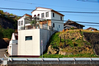 水呑川に沿って弓道場方向に進みますGONsanですけど、この辺りまでヤッて来ますと、いつも眼が向きますのが対岸の市道脇のこのお宅。傾斜地を上手く活かしたお住まいで、このお宅を眼にします度に傾斜地の部分の内部、間取りは、どぅなているんだろう…≠ニ関心が(^-^)