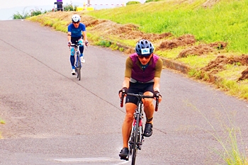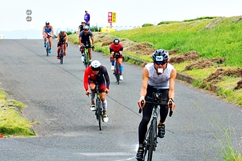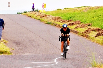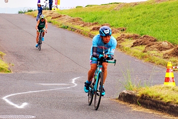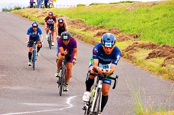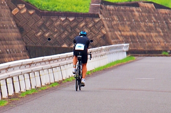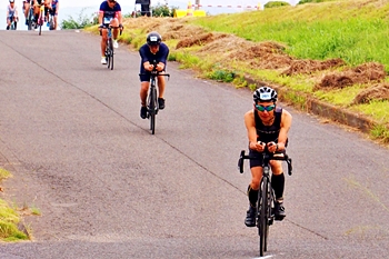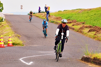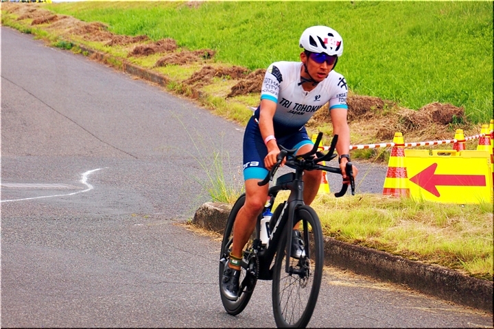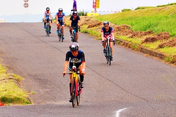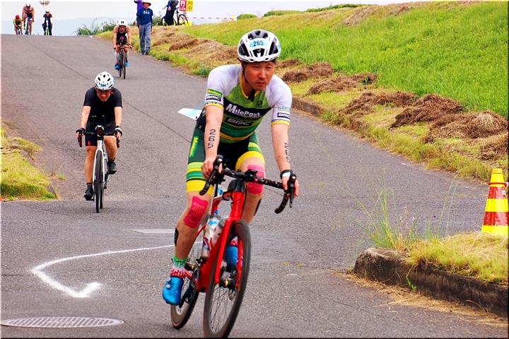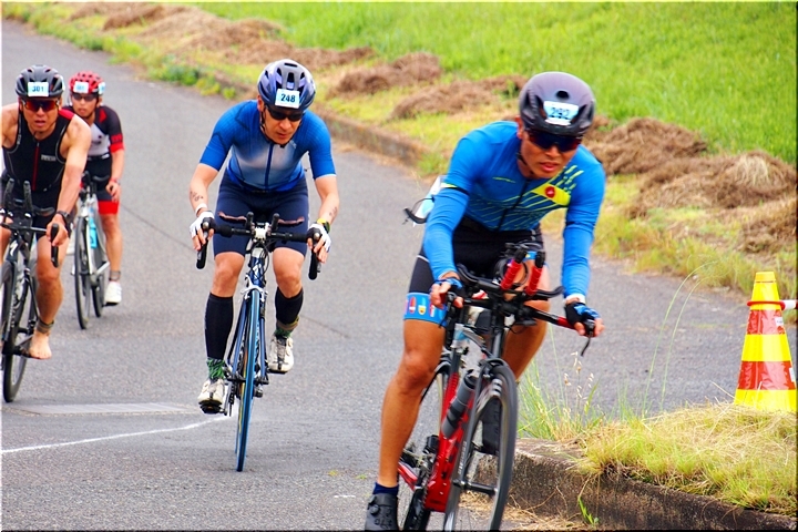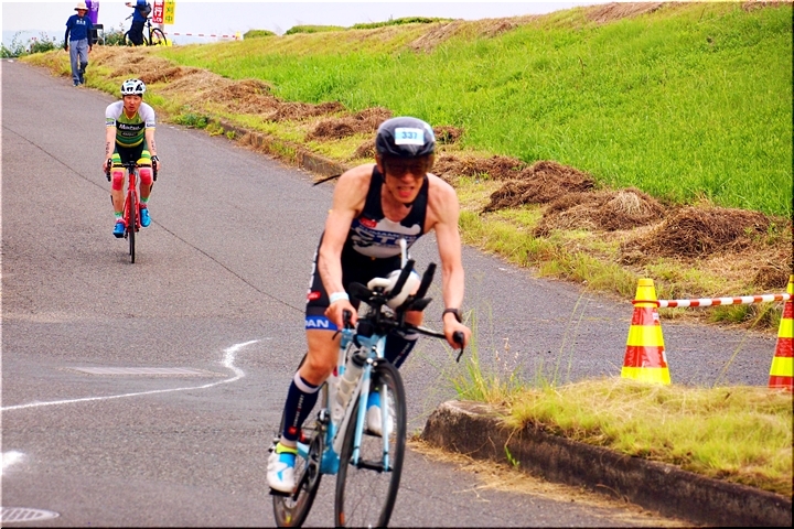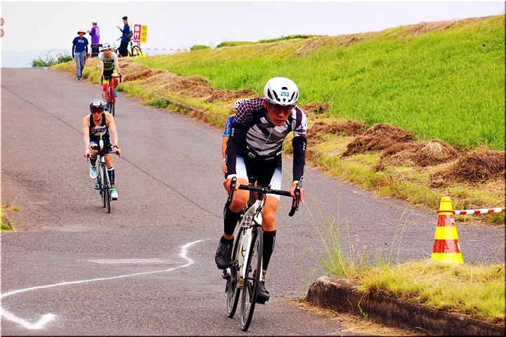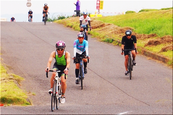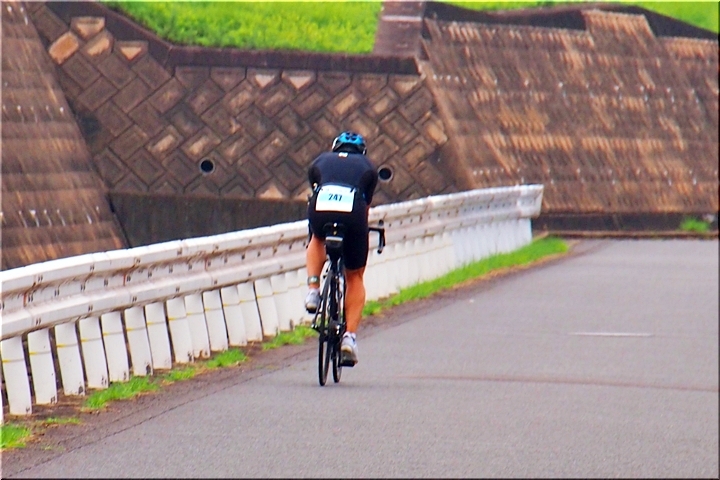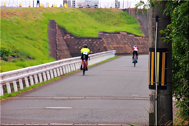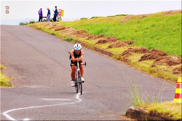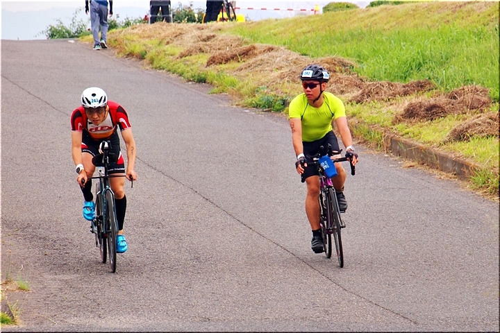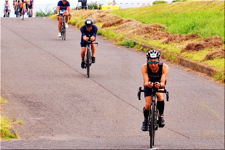 スタンダードディスタンス -- 午前9時10分スタート ですから、既に競技は始まっておりまして、若草園東側の土手下では次々とバイクの選手が通過です。