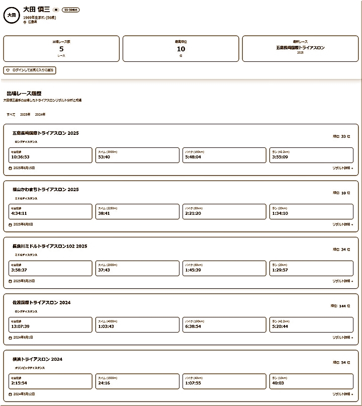 五島長崎国際トライアスロン 2025 -- ロングディスタンス 順位:33位 総合記録 10:36:53 スイム (3,000m)53:40 バイク (160km) 5:48:04 ラン (42.2km) 3:55:09 2025年6月15日