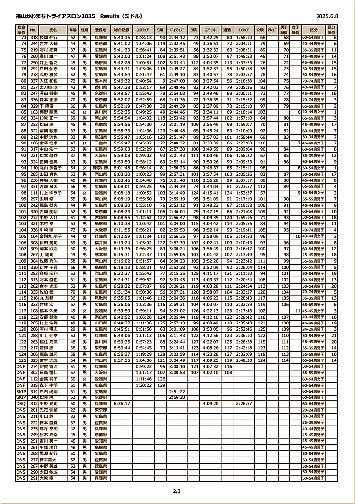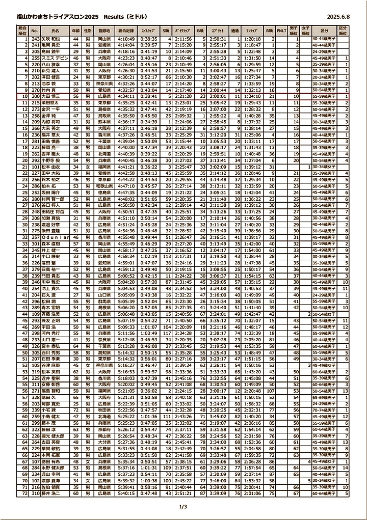 福山かわまちトライアスロン 2025 -- ミドルディスタンス 順位:10位 総合記録 04:34:11 スイム (2250m)38:41 バイク (80km) 2:21:20 ラン (20km) 1:34:10 2025年6月8日