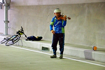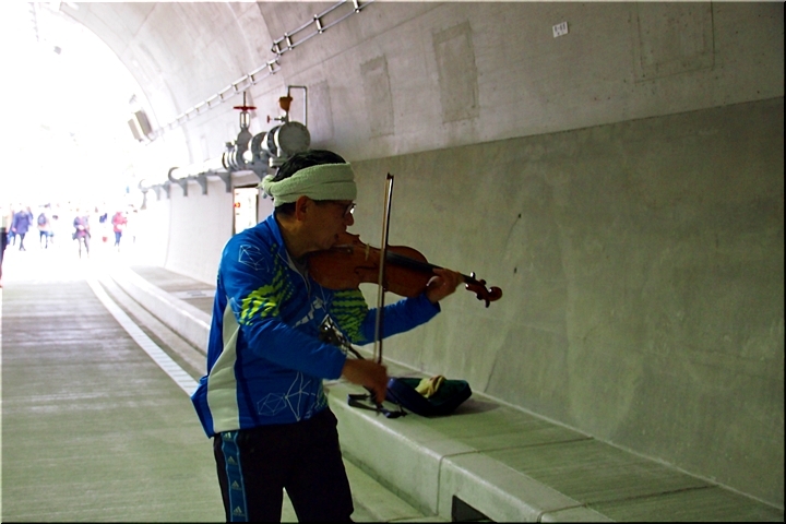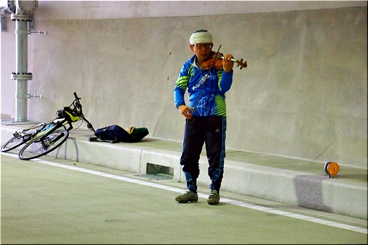 次第に前方が明るくなって来まして平地区入口≠ェ近付いて来ました。入口付近では、年配の男性がヴァイオリンのソロ演奏中。ふ〜ん、自転車でヤッて来られて、公衆の面前で演奏ですから、よほど腕に自信がお有りの方かも…