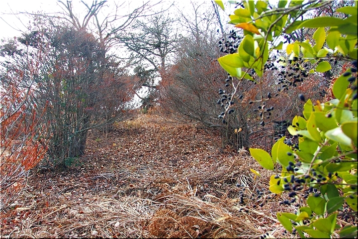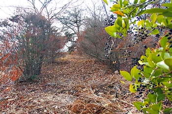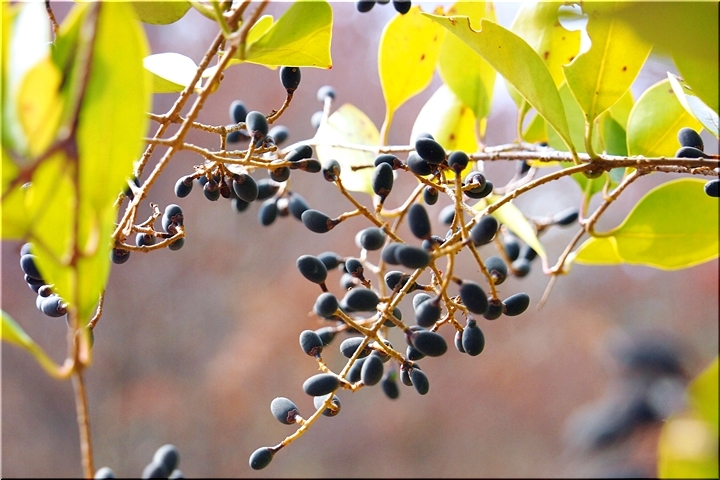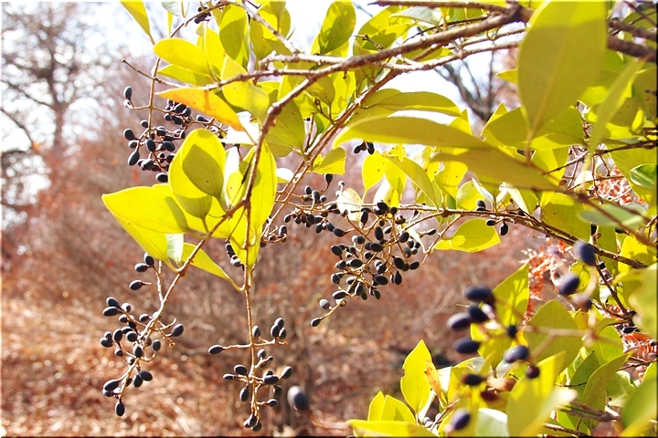 ユックリと進んで行きますと、また前方を樹木が遮っています。その手前に、クロっぽい実を付けた樹木が…これは何なんでしょうネ。