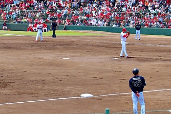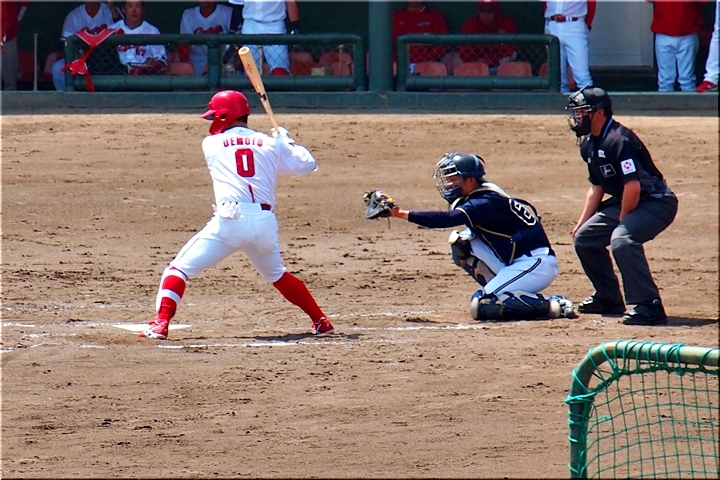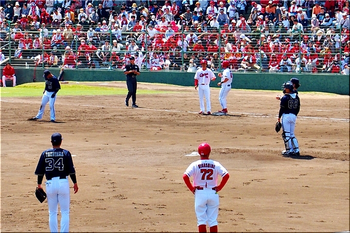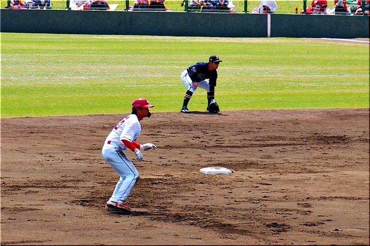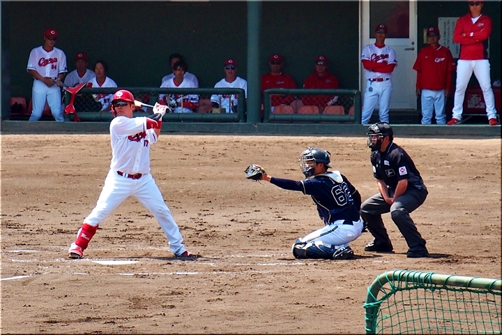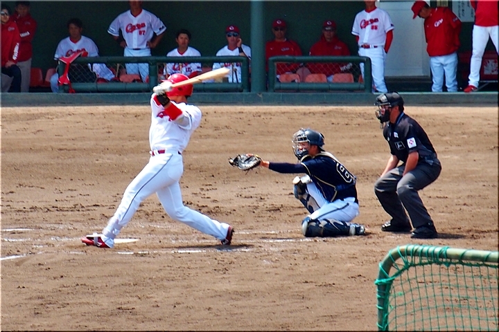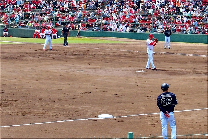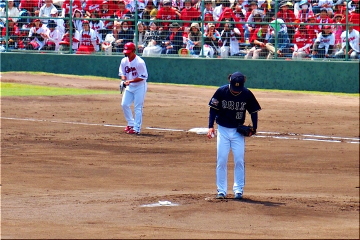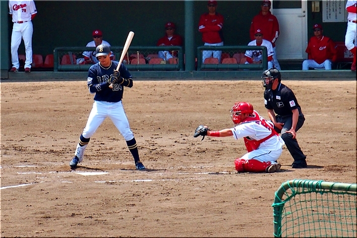 オリックス2×0カープ≠ニ、2点リードで迎えました2回表のオリックス。横山聖・河野・堀の3選手とも凡打・三振で追加点ならず。開始早々2失点の杉田健投手も、立ち直って来ましたようですネ(^.-)☆