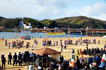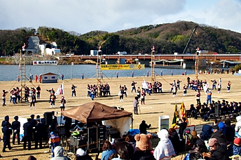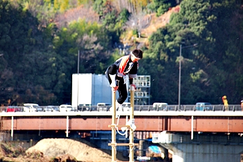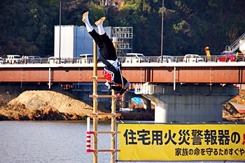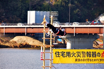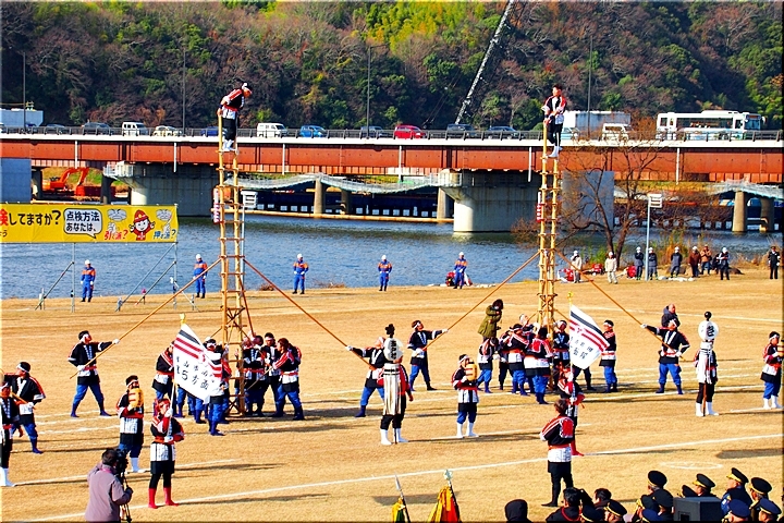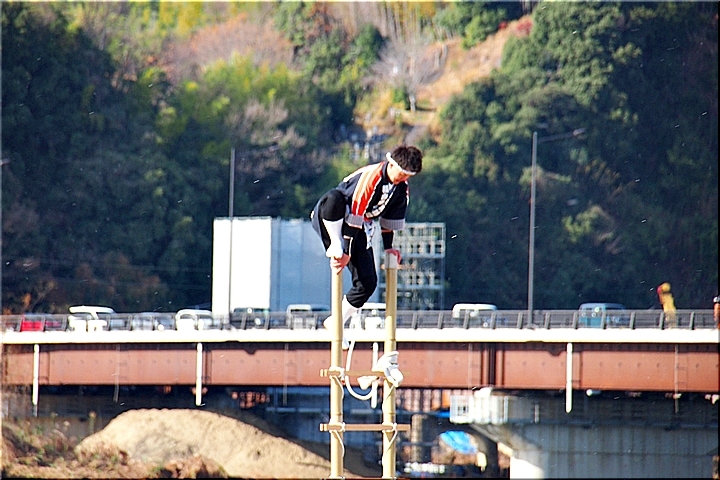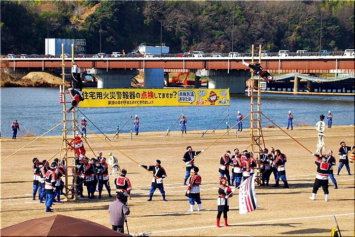 木遣≠ヘ、今回は、従来の8分団の半数です。加茂・瀬戸・東村・道上の4分団の皆様が強風に揺れる中、見事な演技を披露です(^.-)☆
