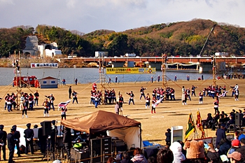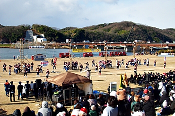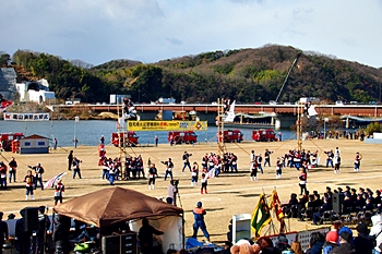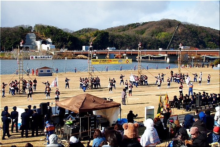 木遣#笘Iの最後には、「火の用心」か何かの防災標語を掲げた横断幕を披露されるのですけど、今回ばかりは、あまりにも風が強くて下に垂れ下がりませんで、何と書かれていましたのか分かりませんでしたネ(^-^;