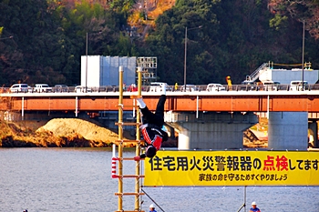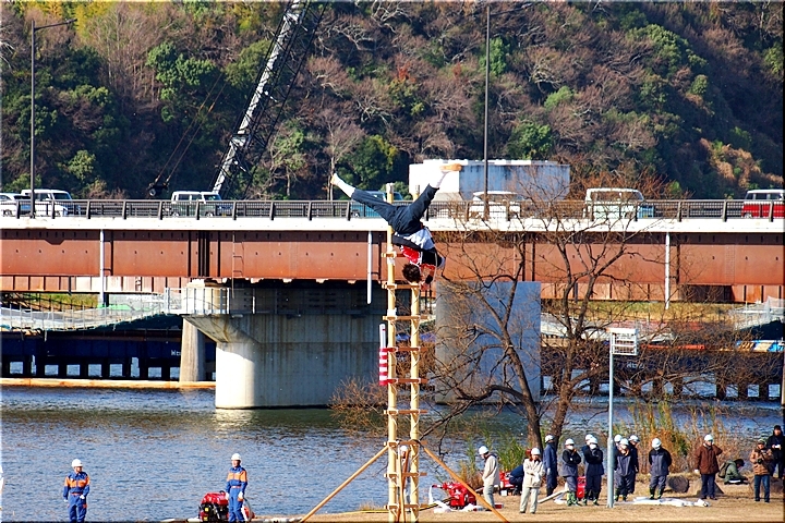 強風で冷たい中、ハシゴの先端で演じられます方は大変でしたでしょうけど、恐怖感は有りませんのかも…