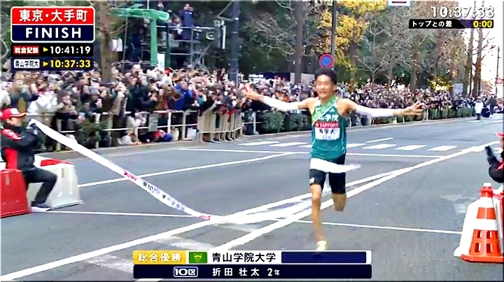 6区の山下りではルーキーの石川浩輝が後続との差を保持したまま7区へつなぐと、2年生の佐藤愛斗もトップを譲ることなく8区へ。8区では塩出翔太が圧巻の走りで3年連続の区間賞を区間記録更新と合わせて獲得した。9区の佐藤有一も区間賞の走りを見せると、10区の折田壮太がトップでゴールテープを切り、3年連続となる総合優勝を飾った。総合タイム、往路タイム、復路タイムとすべてを更新し、圧倒的なチーム力を見せた。