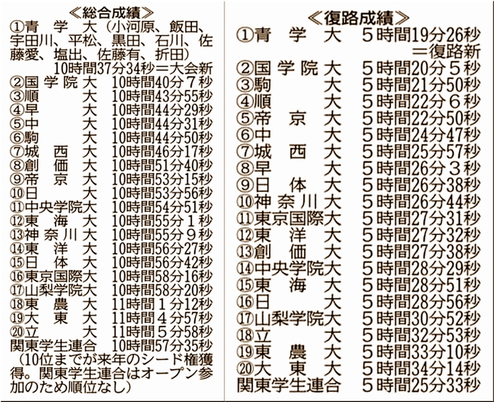 3位の順天堂大は予選会からの本戦出場となったが、往路6位から順位を上げる結果となった。