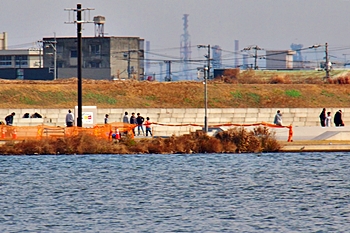 水呑大橋が近付いて来ますと、大晦日に上りました山側の妙見神社・鐘楼≠パチリです。そして、対岸のかわまち広場≠フ一角にありますスケートパーク≠焜pチリ。若者の皆さんが賑やかにスケボーを楽しんでいます様子が、ここまでハッキリ聞こえておりましたネ(^.-)☆