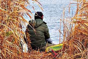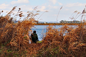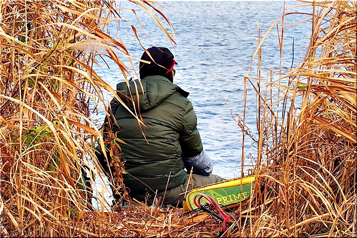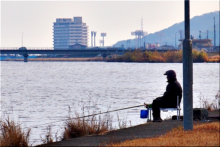 水呑大橋下で折り返しての帰路では、お二人の釣り人もパチリです。